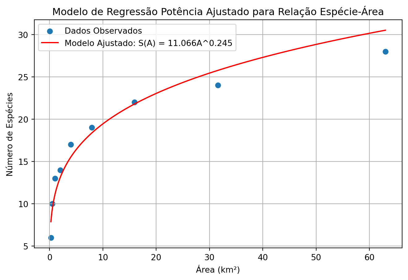 O modelo de regressão potência para a riqueza de espécies, com base nos dados fornecidos, foi determinado como