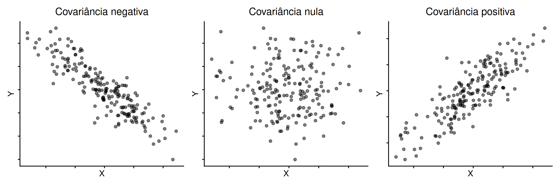 Observamos que a associação pode ser positiva (quando \(X\) aumenta, \(Y\) também aumenta), negativa (quando \(X\) aumenta, \(Y\) diminui) ou nula (sem padrão linear aparente). Buscamos uma medida que quantifique a direção e intensidade desse padrão.