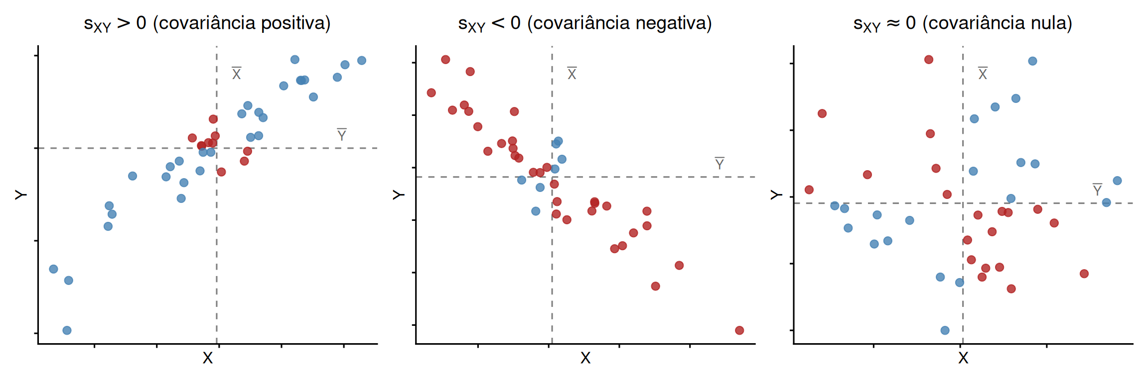 No gráfico de dispersão, as retas \(X = \bar{X}\) e \(Y = \bar{Y}\) dividem o plano em quatro regiões. O sinal de cada produto \((X_i - \bar{X})(Y_i - \bar{Y})\) depende de onde o ponto está: