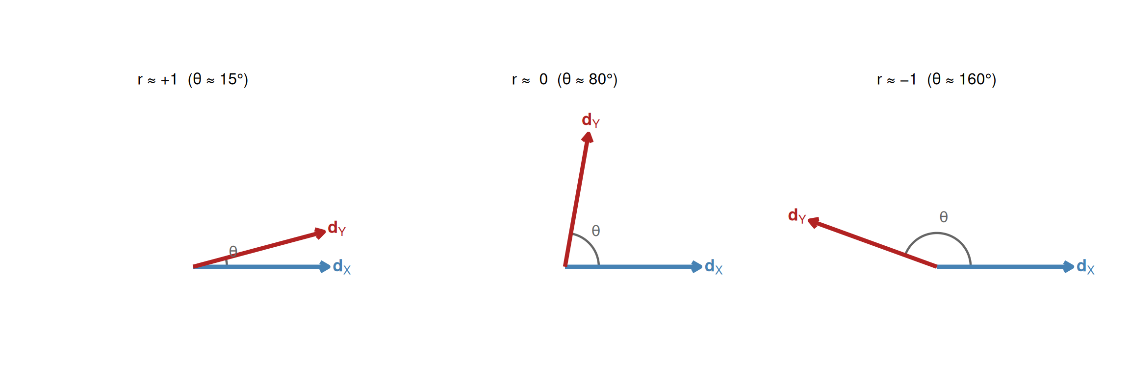 \[r = \frac{\mathbf{d}_X^\top\mathbf{d}_Y}{\|\mathbf{d}_X\|\,\|\mathbf{d}_Y\|} = \cos\theta\]